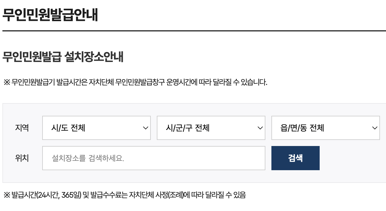 무인발급기는 지하철역, 주민센터, 복지센터, 보건소, 학교, 병원, 새마을금고 등 주변 여러 곳에 설치가 되어 있습니다. 각 지역의 무인발급기 위치는 아래 링크에서 지역별로 검색이 가능하니 참고하세요.