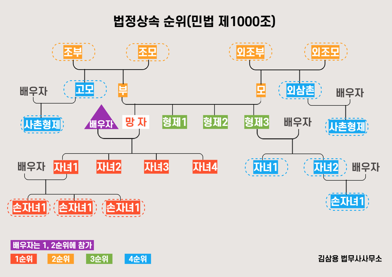 상속 순위는 민법에 명시되어 있으며, 피상속인의 관계에 따라 다음과 같이 정해집니다: