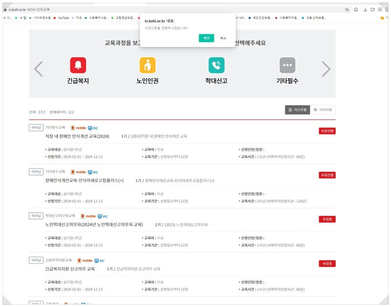 이 외에도 성희롱 예방교육, 개인정보 보호교육 등 다양한 과정이 있으며, 종사자들은 해당 직종에 맞는 교육을 선택하여 이수할 수 있습니다.
